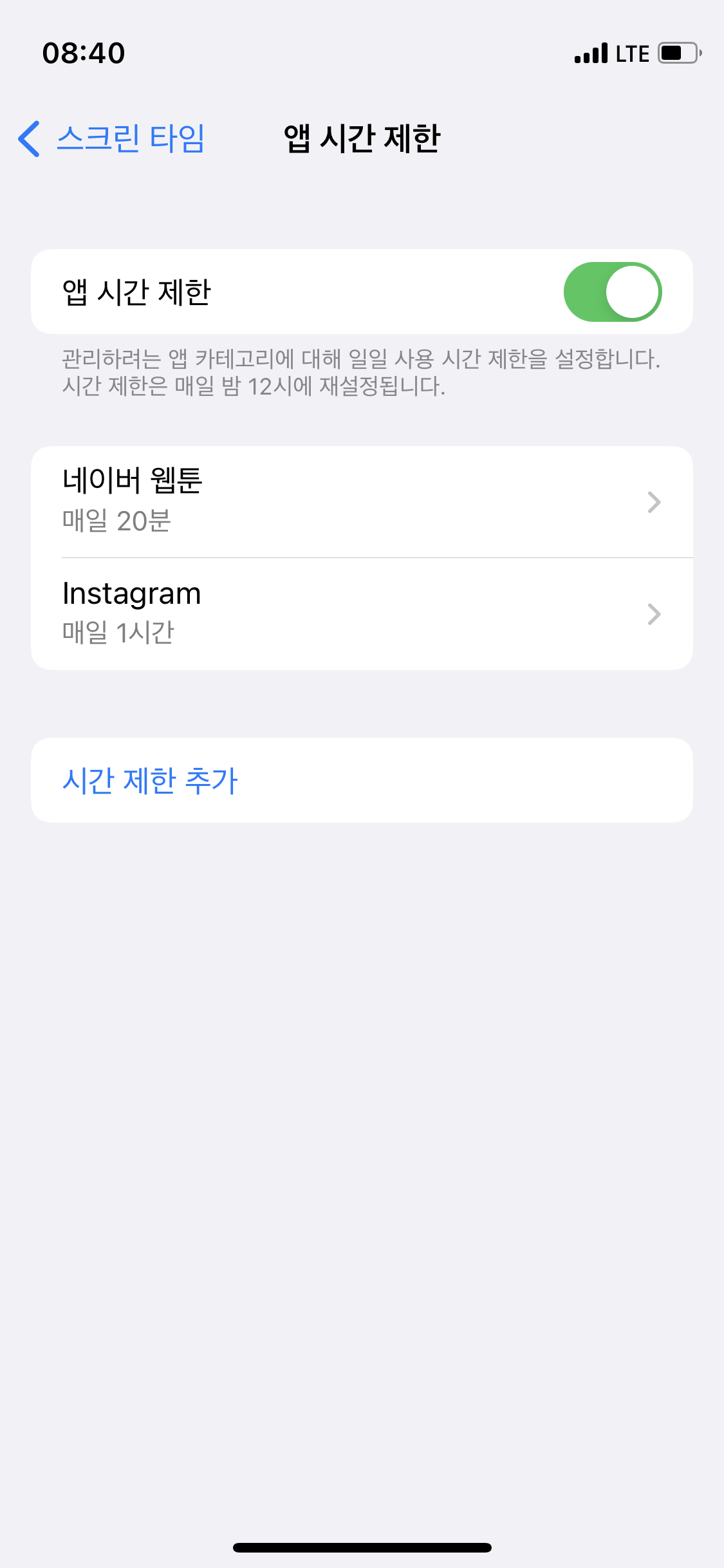 설정 - 스크린 타임 - 앱 시간 제한 - 시간제한 추가